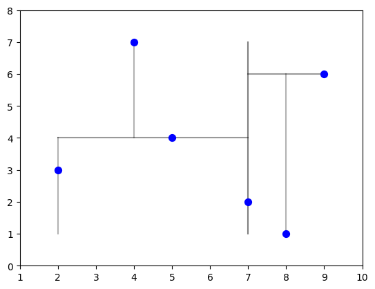 draw_kdtree(ax, node.right, depth + 1, min_x, max_x, node.point[node.axis], max_y)